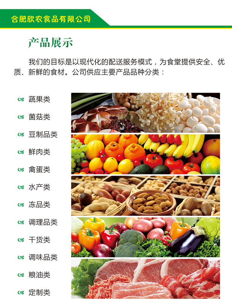 我們深知食品安全必須從源頭控制開始把控,公司與合肥市周邊多家大型種、養殖基地建立長期合作關系,在實現采購源頭化的同時,我們對基地產品的生長過程進行全程監控;肉類及冷凍制品、干調糧油等與有名廠商直接合作,在確認產品質量的同時也降低了采購成本。
